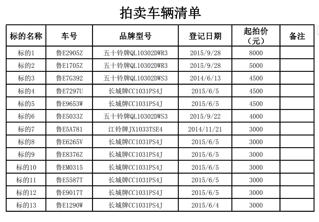 五十鈴牌、長(zhǎng)城牌皮卡等舊機(jī)動(dòng)車(chē)共13輛,單個(gè)拍賣(mài),車(chē)輛信息、起拍價(jià)等詳見(jiàn)《拍賣(mài)車(chē)輛清單》。競(jìng)買(mǎi)保證金1萬(wàn)元。