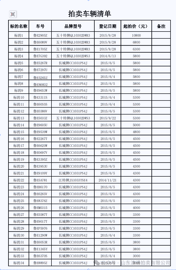 五十鈴牌、長城牌皮卡等舊機動車共34輛,單個拍賣,車輛信息、起拍價等詳見《拍賣車輛清單》。競買保證金1萬元。