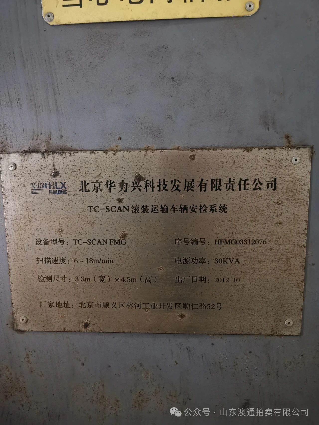 1、滾裝運(yùn)輸車(chē)輛安全檢查系統(tǒng),型號(hào):TC-SCAN FMG,安裝時(shí)間:2013年,掃描速度:6-18m/min,電源功率:30KVA,檢測(cè)尺寸:3.3m(寬)x4.5m(高),出廠日期:2012年10月,由北京華力興科技發(fā)展有限責(zé)任公司生產(chǎn)。
